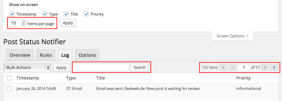 In the “Log” section you will see a table containing all log entries the plugin rules have generated.